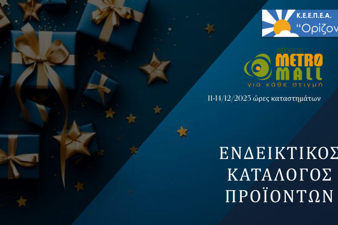 Στο παρακάτω σύνδεσμο θα δείτε τον ενδεικτικό κατάλογο με προϊόντα από το Christmas Bazaar μας που θα πραγματοποιηθεί στο Athens Metro Mall από τις 11-14/12/2023 σε ώρες καταστημάτων . Χειροποίητες χριστουγεννιάτικες κατασκευές, στολίδια, γούρια, αρωματικά κεριά, σαπούνια και κοσμήματα για εσάς και τους φίλους σας!